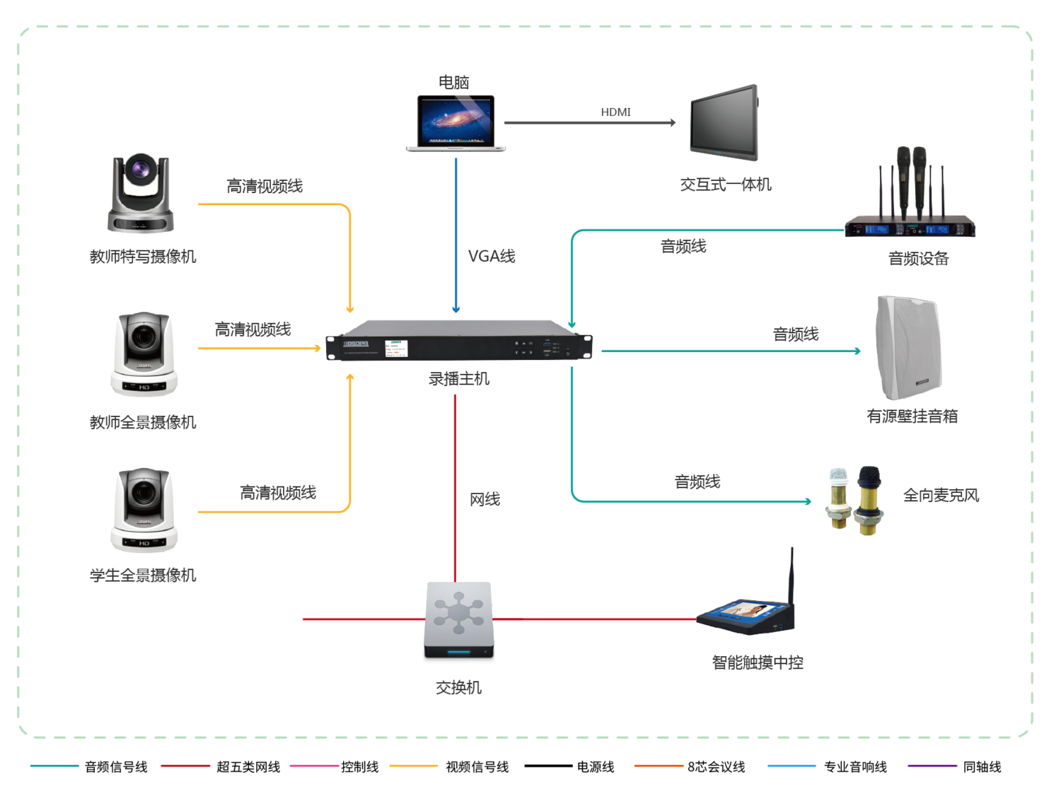 系统概述 常态化录播系统是基于各区域不同的课室状况,以常态云录播主机为核心,解决学校普及录播课室需求的录播系统,能够帮助学校提供真实可信的课堂大数据,建立资源存储平台,有效实现教师教学简单化、学生学习效率化、教学资源集中化、教学方式信息化,打造“课堂用、经常用、普遍用”的信息化教学新常态。 系统特点 1.高集成度内嵌录播、跟踪、互动、音频处理四大功能,简化系统架构,便于维护管理。 2.便捷操控九寸触控屏,独创视频画面预览与导播,教师可轻松掌控专业录播设备,人性化面板设计,放置在讲台上使用,“一键式” 操纵体验,傻瓜式操作 3.高性价比 系统功能 1.手动导播无需额外导播软硬件,直接使用浏览器访问导播,不受地点限制;支持两种方式手动控制摄像机。 2.同步录制录制高清教学视频,支持画面同时录制,支持自定义原画和码特率,满足用户的各种网络状态需求,超大存储空间,随心随意录制精美课程资源。 3.录制多格式录制格式:MP4、FLV、TS 、MOV、MKV、AVI六种格式可选设置。支持高码流和低码流的同步录制,1-10M码流可选。多通道全高清录制,可任意选择同时录制PGM、计算机画面及摄像机视频画面。标准HTTP/RTSP/RTMP/HLS直播及点播接口,XML数据交换技术,轻松对接云平台。 4.实时直播内外网实时教学直播,支持局域网/公网直播,系统已集成rtmp流自动实施模块。支持 iPhone / iPad /Android等移动终端,畅享无边界网络直播,支持浏览器直接输入主机IP即可收看直播,无需安装任何软件。 系统拓扑图 ![]() |