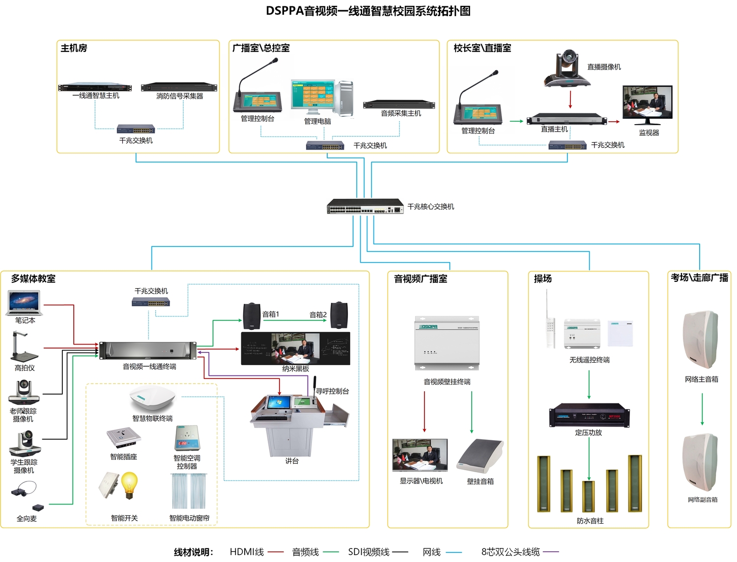 系统概述 音视频一线通智慧校园系统是集音频、视频、传输与控制、常态化录播于体的高度融合系统,具有超强的音视频编解码能力,满足广大学校对音视频广播、直播、音视频交互、常态化录播、智能控制等实际需求,一机搞定,每个教室都是录播教室,是智慧校园建设的首选。 系统由音视频一线通智慧主机、直播主机、音视频一线通终端、管理控制台、寻呼控制台、智慧物联终端等设备组成。通过局域网,系统总控中心与各个教室实现互联互通。管理人员需要发布音视频业务时,只需要在总控中心的软件或设备界面上操作即可。 系统改变传统音视频系统的设计理念,将音频、视频、控制、传输、录播集于一体,采用较为灵活的系统设计结构,一条网线即可快速搭建所需系统,并可按实际需求随时增加各种功能接点;该系统针对教育行业设计,实现了多媒体教学、设备集中控制、优质课堂录播、网络传输、教育运营平台统一管理等功能。一线通同样功能采用其他系统实现,一线通成本大概可节省60%。 系统特点 1. 传输网络化 ,音视频一线通智慧主机是一个以Linux为基础的分布式多媒体融合通信系统,实现数字音视频传输、音视频广播、交互、常态化录播、大数据服务的大型网络信息交互平台; 2. 操作个性化 ,音视频一线通管理控制台是基于Android平台的可视化操作控制台,它具有操作简单流畅、个性化需求定制等优点; 3. 数据安全化 ,嵌入式主机架构,工业级嵌入式CPU,Linux操作系统,流媒体专用主机,数据安全多重保障,支持7×24小时不间断稳定运行; 4. 施工简单化 , 支持B/S和C/S架构,支持在PC端和Android移动端使用Web网页或者APP软件对系统进行控制操作; 5. 智能控制化 ,智能控制,包括多媒体设备(电脑、高拍仪、投影等)和环境设备(灯光、空调、窗帘等)。 系统功能 1.广播,包括音视频广播 、寻呼广播、打铃广播和紧急广播等功能; 2.常态化录播,包括在线直播、互动课堂、课堂录播和视频共享等功能; 3.智能控制,包括内置中控、物联控制、IC卡联动和集中控制等功能; 4.内置电脑,包括授课专用、文字编辑、资源上传和系统管理等功能; 5.其他功能,包括内置无线2.4G、授课多用麦和内置功放等功能。 系统拓扑图 ![]() |